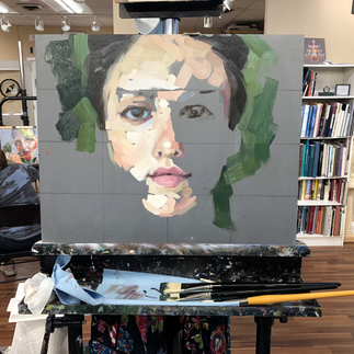 For the practical exercise portion of the workshop, Allysa had us select a few portraits, sketch them out and decide which ones to paint, quickly paint two at a 4x6" mini size to better understand the color and relationships to hold the form together, and then take that to a 12x16 or 16x20" size. Below is my start along with the gorgeous marks made by Alyssa during her allotted 15 minutes with me. (So impressive that she got around to EVERYONE in class and gave us all quality 1:1 time!)